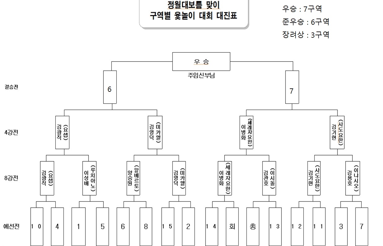 친교 , 화합 , 나눔의 윷놀이 대회에 전 신자분들이 참여해 주셔서 잘 마쳤습니다. 우승 7구역 , 준우승 6구역 , 장려상 3구역 모두 축하드립니다.빨랑카를 보내주신 모든 분들께 감사드립니다.내년에는 좀 더 보람차고 즐겁고 재미나게 윷놀이 행사를 진행하겠습니다.우리 구역장님, 간부님 모든 노고에 감사드립니다. 화이팅!