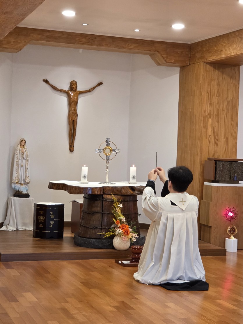 피정시작은 "무릎을 꿇은 낙타'로 1시간 강의를 듣고 경당에서 성체강복의