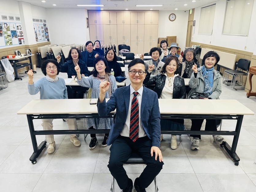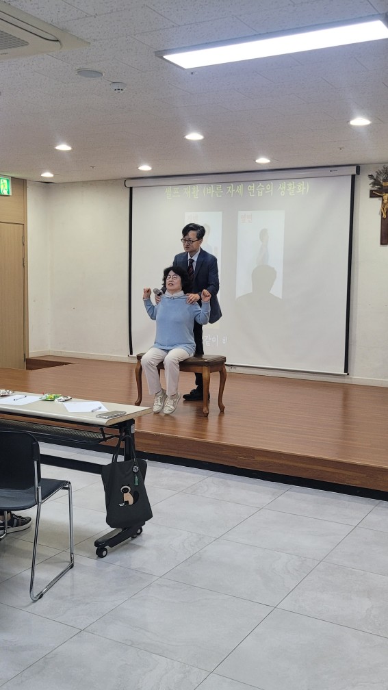 -날자:11월8일 토요일 오후2시-장소:지하1층 성가정방 사피엔스 작은도서관 4차 강의가 박성진 재활의학과원장님을 모시고 시니어분들의 관절건강과 올바른 자세교정에 대해 실습과 자세한 설명을 해주셨습니다무심코 하는 습관적인 자세가 시니어분들의 삶을 더욱더힘들게하니 간단한 자세교정으로도 더나은 건강을 유지할수 있으니 다같이 실천해 나가도록 합시다