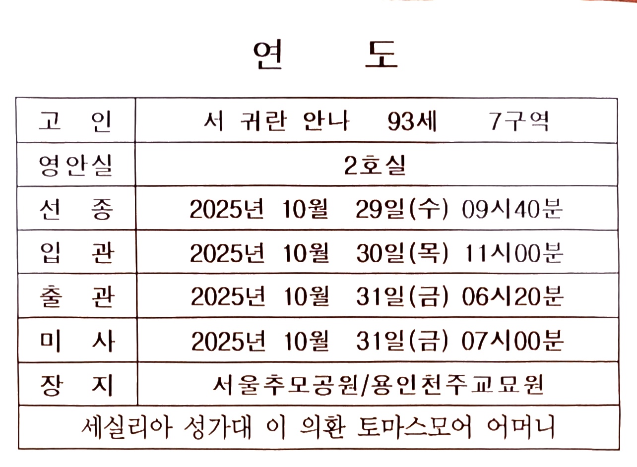 2025.10.29(수) 선종안내: 서귀란 안나(7구역)